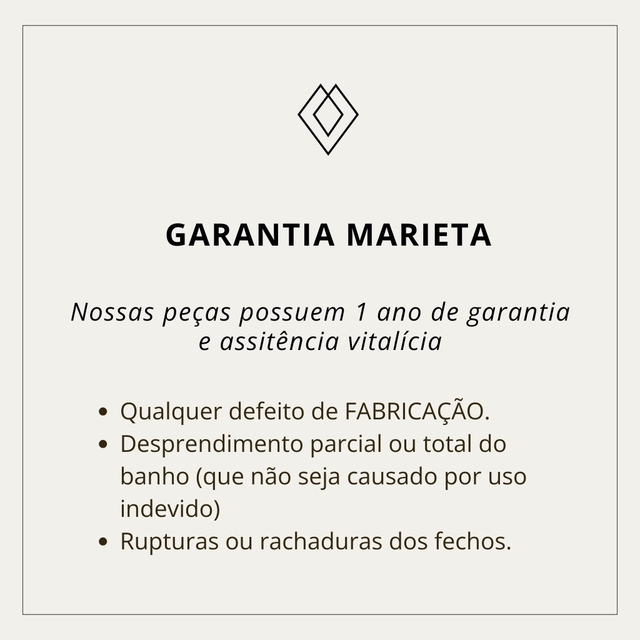 Defeitos causados por mau uso, falta de cuidados com a semijoia, quedas ou, qualquer outro motivo que resulte em avarias, não serão admitidos pela loja no quesito garantia.
